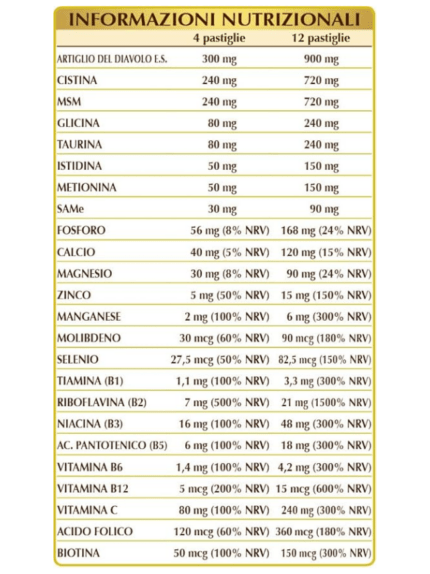 Artiglio del diavolo (Harpagophytum procumbens) radici E.S. (titolato al 4% in arpagoside), cellulosa microcristallina°, gomma arabica°, (L-)cistina, MSM (metilsulfonilmetano), calcio fosfato bibasico, magnesio glicerofosfato, glicina, taurina, vitamina C (acido ascorbico), SAMe (S-adenosil metionina disolfato tosilato), (L-)istidina, (L-)metionina, silicio biossido°°, zinco gluconato, magnesio ossido, manganese gluconato, vitamina B3 (nicotinamide), magnesio stearato di origine vegetale°°, vitamina B2 (riboflavina), vitamina B5 (pantotenato di calcio), vitamina B6 (piridossina cloridrato), vitamina B1 (tiamina cloridrato), acido folico, sodio molibdato, sodio selenito, biotina, vitamina B12 (cianocobalamina). °Agente di carica. °°Antiagglomerante.