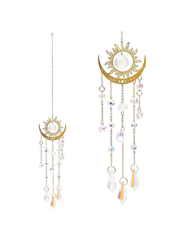 Questo acchiappasole presenta un motivo traforato decorativo con sole e mezzaluna in metallo dorato. Al centro pende una sfera in vetro cristallo che cattura e riflette splendidamente la luce del sole, creando un effetto luminoso scintillante e suggestivo in casa.