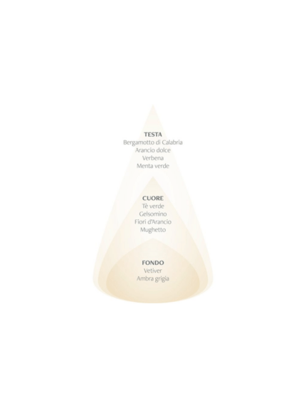 La freschezza degli agrumi, accentuata da un tocco di Menta verde, si approfondisce nel cuore della fragranza con il Tè verde e le note fiorite.