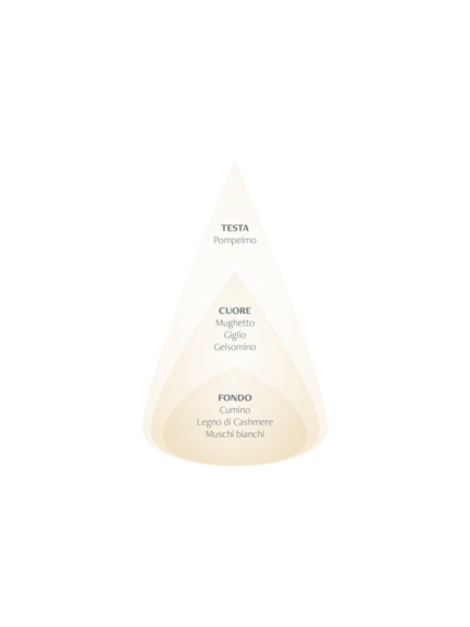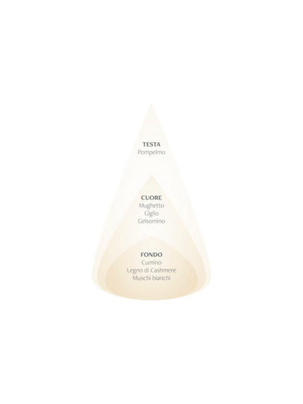 La sensualità del Gelsomino, resa più frizzante dal Pompelmo e più sfaccettata dal Mughetto e dal Giglio, incontra un inedito, caldo e avvolgente abbraccio nelle preziose note del legno di Cashmere.