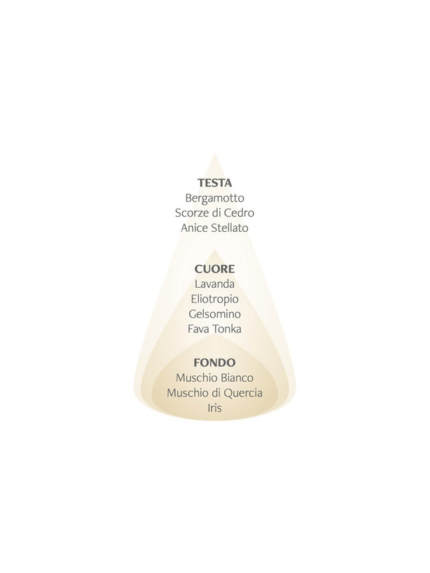 Note vivaci e agrumate fanno da cornice ai protagonisti sentori di Lavanda, che si fondono negli accordi fioriti e nei puliti accenni di Muschio Bianco, Muschio di Quercia e Iris.
