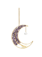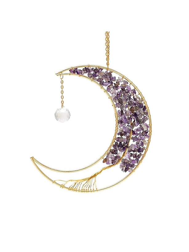 Acchiappasole a forma di mezzaluna con un albero della vita in filo di rame, decorato con piccole scaglie di ametista. Completato da un pendente in cristallo sfaccettato che diffonde la luce in riflessi brillanti. Aggiunge un delicato tocco viola e un senso di armonia a finestre e interni, ideale per negozi con assortimenti spirituali o decorativi.