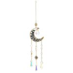 Acchiappasole a forma di mezzaluna, decorato con piccole scaglie di pietra di luna rosa e un pendente in cristallo sfaccettato che diffonde la luce in riflessi brillanti. Porta un tocco di luce a finestre e interni, ideale per negozi con articoli spirituali dal gusto elegante.
