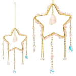 Questo acchiappasole è realizzato con una struttura in metallo dorato a forma di stella, decorata con piccole schegge di ametista. Appeso a una finestra o in un ambiente luminoso, cattura e riflette la luce con eleganza, aggiungendo un tocco di brillantezza alla stanza.