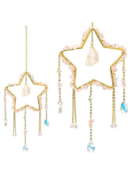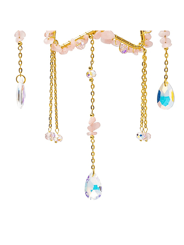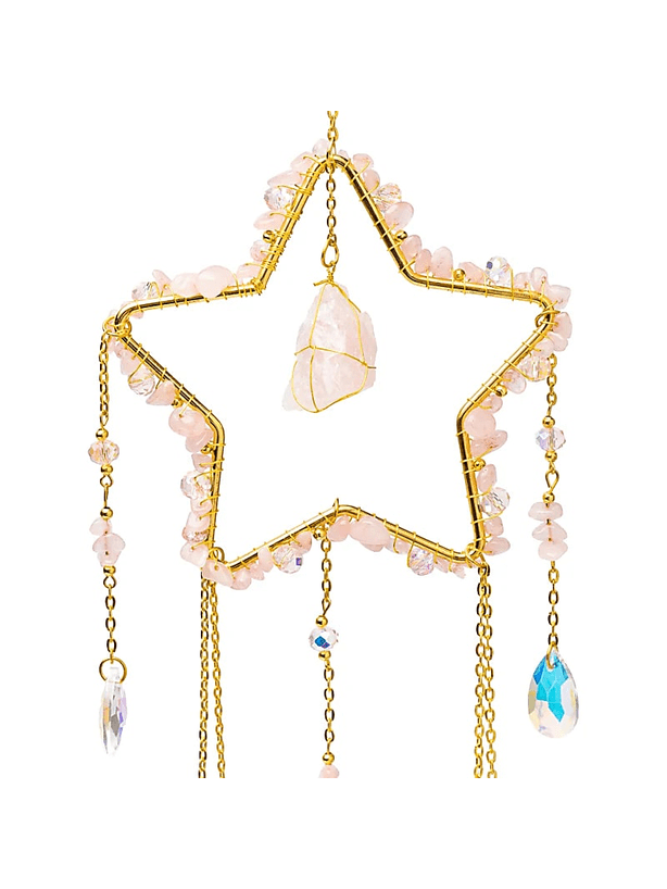 Questo acchiappasole è realizzato con una struttura in metallo dorato a forma di stella, decorata con piccole schegge di quarzo rosa. Appeso a una finestra o in un ambiente luminoso, cattura e riflette la luce con eleganza, aggiungendo un tocco di brillantezza alla stanza.