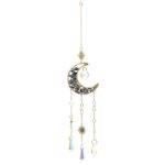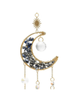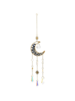 Acchiappasole a forma di mezzaluna, decorato con piccole scaglie di lapislazzuli e un pendente in cristallo sfaccettato che diffonde la luce in riflessi brillanti. Porta un tocco di luce a finestre e interni, ideale per negozi con articoli spirituali dal gusto elegante.
