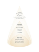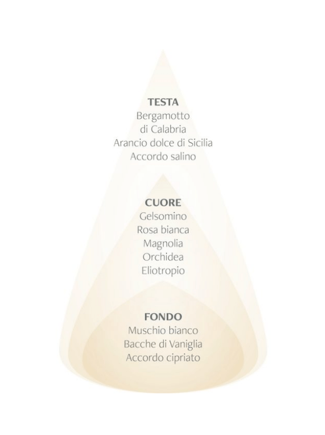 L’aroma dolce della Vaniglia, avvolto da una sinfonia di note cipriate e Muschio bianco, si scopre attraverso un cuore fiorito e l’apertura frizzante dell’accordo salino, con accenni agrumati.