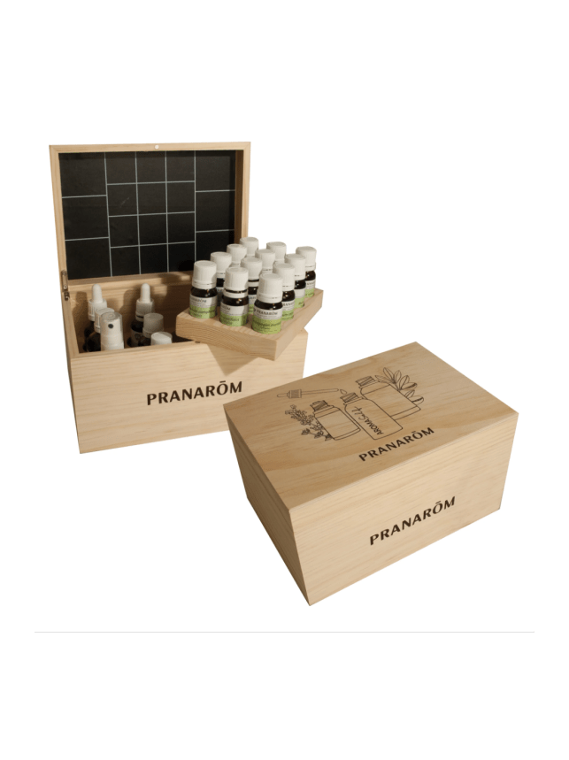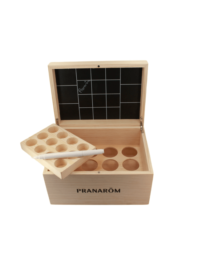 Scatola in legno con spazio per 18 flaconcini di oli essenziali, oli vettore e flaconi vuoti (contagocce, roller e spray). Sotto il coperchio è presente una pratica lavagnetta per riportare i nomi delle soluzioni. Un vassoio rimovibile per 12 oli essenziali offre maggiore flessibilità. Pennarello incluso.