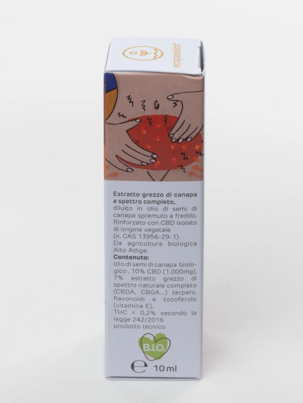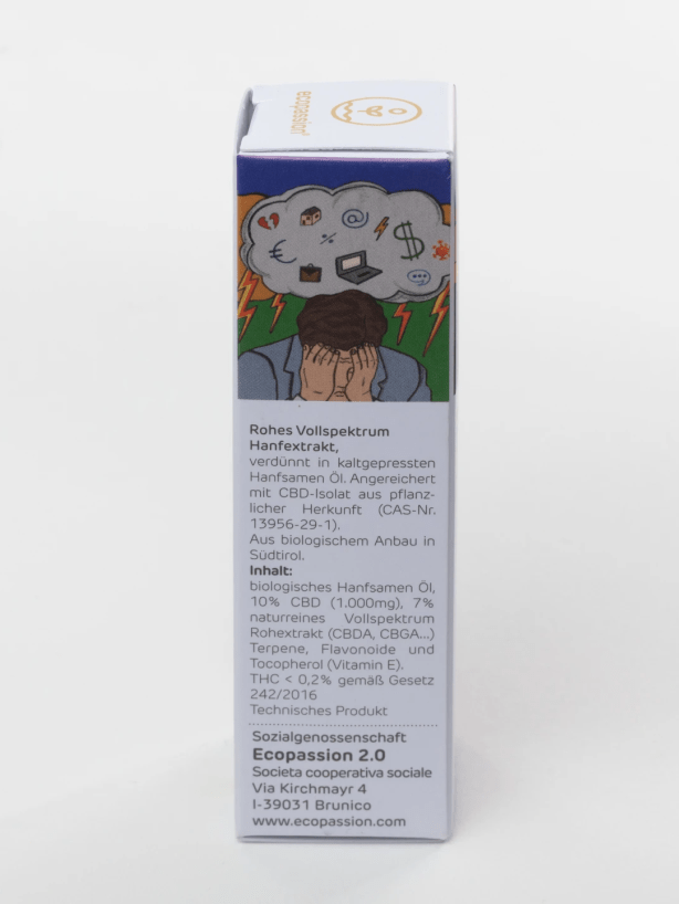 ecopassion® CBDphytoCOMPLETE© 10% è un estratto grezzo di canapa naturale a spettro completo, in forma aminoacida rinforzato con CBD isolato (1.000 mg Cannabidiolo) di origine vegetale organica e diluito in olio di canapa certificato BIO. Coltivato e prodotto in Alto Adige.