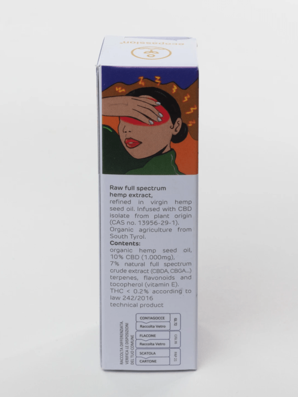 Olio di semi di canapa biologico, 10% CBD (1000 mg), 7% estratto grezzo di spettro naturale completo (CBDA, CBGA…) terpeni, flavonoidi e tocoferolo (vitamina E). THC < 0,2% secondo la legge 242/2016. Prodotto tecnico.