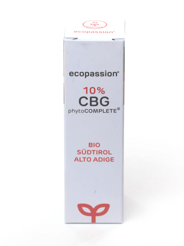 ecopassion® CBGphytoCOMPLETE© 10% è un estratto grezzo di canapa naturale a spettro completo, in forma aminoacida rinforzato con CBG isolato di origine vegetale organica (1.000 mg Cannabigerolo) e diluito in olio di canapa certificato BIO. Coltivato e prodotto in Alto Adige.