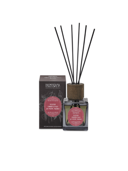 Diffusore a bastoncini Nasoterapia “Rum Ambrato & Vaniglia”, una fragranza calda e gourmand con oli essenziali naturali. Perfetto per creare un’atmosfera accogliente e sensuale negli ambienti della casa. Design elegante con flacone in vetro scuro, tappo effetto legno e bastoncini neri inclusi.