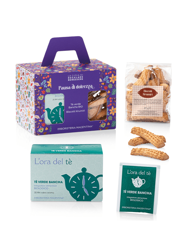 Il Cofanetto Pausa di Dolcezza di Erboristeria Magentina è un elegante set regalo pensato per concedersi un momento piacevole e rigenerante. Al suo interno trovi i Biscotti Krumiri, fragranti e dal gusto autentico, insieme alla Tisana BIO Tè Verde Bancha, un infuso naturale e delicato ideale per una pausa rilassante. Il packaging floreale e colorato rende il cofanetto perfetto come regalo per ogni occasione, mentre la qualità biologica della tisana e la genuinità dei biscotti assicurano un’esperienza di benessere completa e gustosa.