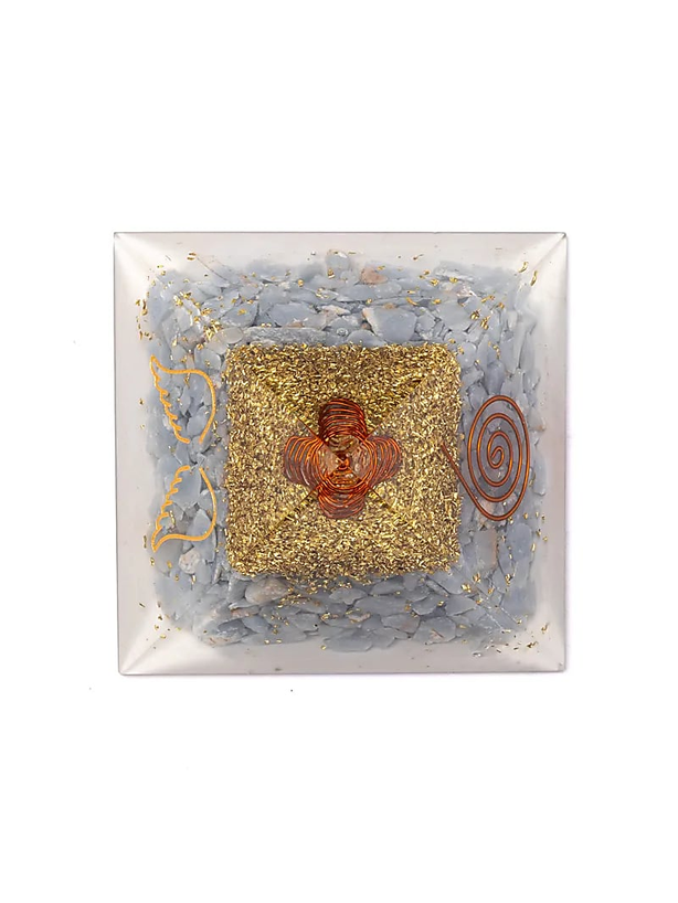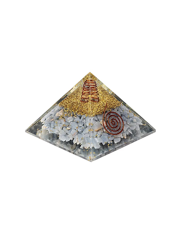 All’interno di questa piramide, piccoli frammenti di angelite sono sospesi nella resina. L’angelite è apprezzata per la sua capacità di infondere calma e favorire una comunicazione gentile e sincera. Il suo delicato tono azzurro è spesso collegato al chakra della gola, centro dell’espressione e della chiarezza.