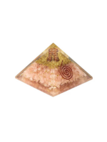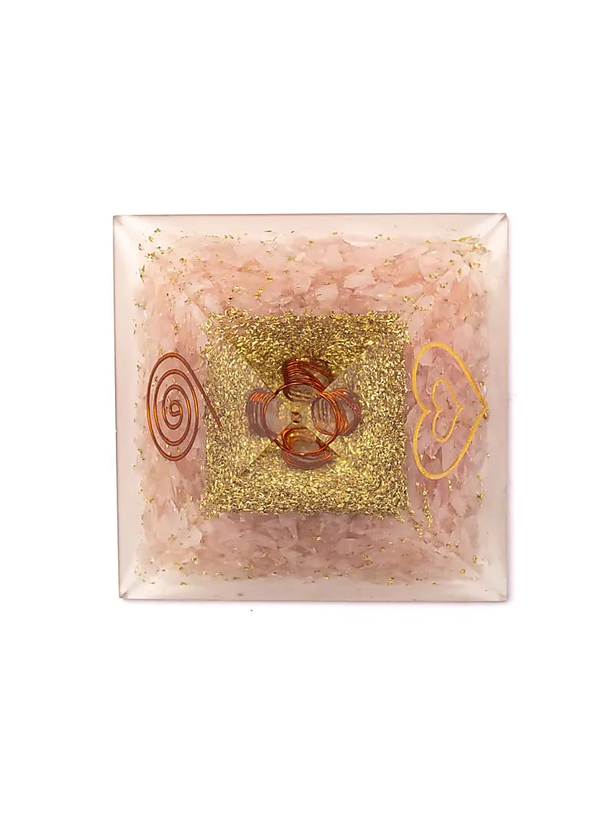 All’interno di questa piramide, piccoli frammenti di quarzo rosa sono sospesi nella resina. Il quarzo rosa è apprezzato per favorire apertura, compassione e armonia emotiva. La sua delicata tonalità è spesso collegata al chakra del cuore, centro di connessione ed empatia.