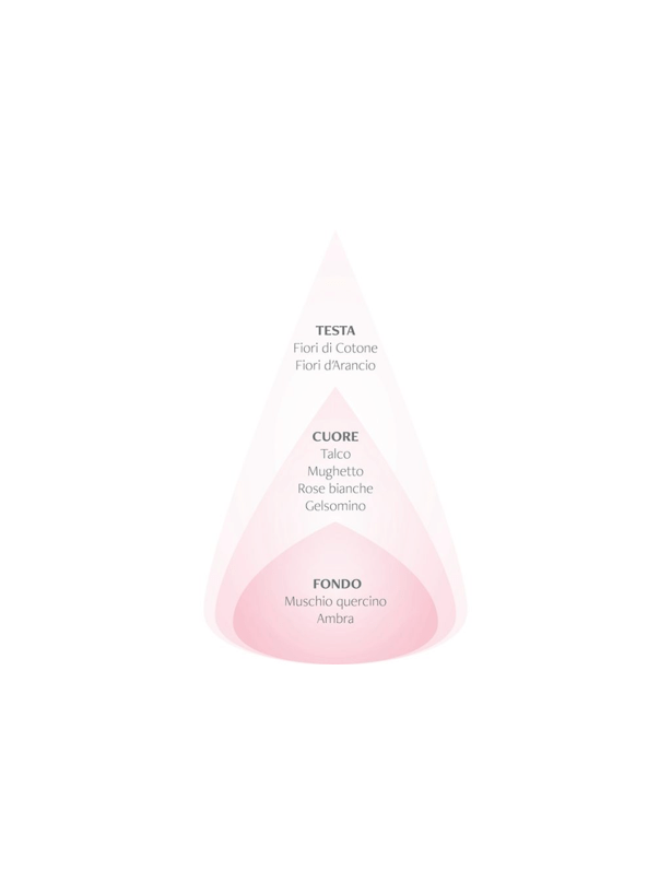 L’abbraccio delicato del profumo dei Fiori di Cotone si unisce con l’olio essenziale di Neroli in un accordo di testa dal delicato profumo dei fiori bianchi che crea un’atmosfera tenue e delicata capace di alleggerire l’animo. Il cuore della fragranza è pulito, muschiato e leggermente fruttato. Il fondo, caldo e avvolgente, unisce le note dell’Ambra a quelle del Muschio di Quercia.