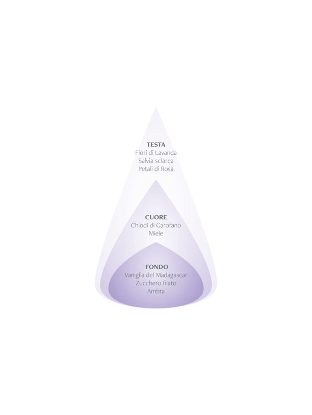 L’inconfondibile profumo di Lavanda, dalle note fiorite e leggermente erbacee e dalle riconosciute proprietà rilassanti, viene arricchito dalle sfaccettature delle note di Salvia e petali di Rosa che arricchiscono le due anime olfattive del fiore. Il cuore della fragranza è dolce e aromatico, frutto di un accordo originale di Miele e Chiodi di Garofano mentre il fondo ha il calore speziato della Vaniglia del Madagascar e dell’Ambra.