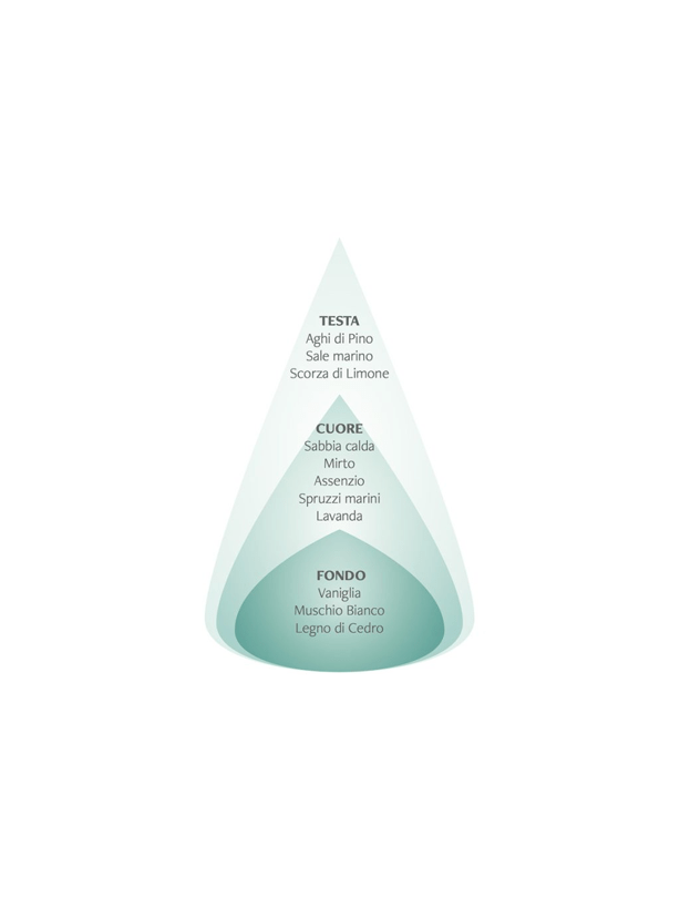 Le note di testa rivelano un’apertura frizzante come una mattinata estiva. I sentori freschi e leggermente canforati degli Aghi di Pino s’incontrano con le note tipicamente estive del Limone e del Sale marino. Il cuore della fragranza, fresco e inebriante, unisce il profumo gioioso del Mirto alle note soffuse e avvolgenti della Lavanda. Le note di fondo danno vita a un accordo asciutto, pulito e leggermente dolce, frutto dell’armonia di Muschio Bianco e Legno di Cedro e Vaniglia.