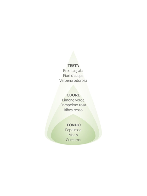 Le note di testa si aprono con la freschezza verde dell’erba appena tagliata e l’eleganza leggera dei fiori d’acqua, esaltate dalla luminosità agrumata della Verbena odorosa. Una partenza vivace che evoca la rugiada del mattino e il contatto con la natura. Nel cuore, l’energia frizzante del Limone verde e del Pompelmo rosa si intreccia con la dolcezza acidula del Ribes rosso, regalando sfumature briose e vitali. A chiudere la fragranza, le note speziate del Pepe rosa incontrano la calda aromaticità del Macis e la profondità dorata della Curcuma, per un fondo avvolgente, ricco di carattere e sfumature sorprendenti.