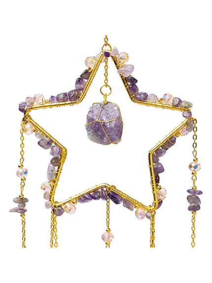 Acchiappasole a forma di mezzaluna, decorato con piccole scaglie di pietra di luna rosa e un pendente in cristallo sfaccettato che diffonde la luce in riflessi brillanti. Porta un tocco di luce a finestre e interni, ideale per negozi con articoli spirituali dal gusto elegante.