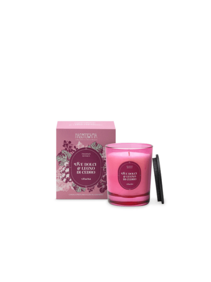Candela profumata con oli essenziali all’uva dolce e legno di cedro, presentata in elegante bicchiere colorato con coperchio; una fragranza fruttata e legnosa che unisce dolcezza e intensità, ideale come accessorio d’arredo per la casa e come idea regalo originale dal design raffinato.