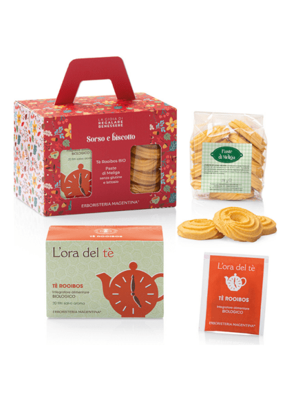 Descrizione Il Cofanetto Sorso e Biscotto di Erboristeria Magentina è il regalo ideale per chi ama concedersi una pausa ricca di sapore e benessere. La confezione contiene le Paste di Meliga senza glutine e lattosio, fragranti e dorate, abbinate alla Tisana BIO Rooibos, un infuso naturale dal gusto morbido e avvolgente perfetto per ogni momento di relax. Il packaging vivace e colorato, tipico delle collezioni regalo Magentina, rende questo set una scelta elegante e raffinata per donare un’esperienza gustosa e rigenerante, ideale per qualsiasi occasione speciale. Tè Rooibos 20 filtri salva aroma, la bevanda, denominata Rooibos o tè rosso africano, si ottiene tramite infusione di foglie tritate, fatte ossidare ed essiccate. Il risultato è una bevanda dal colore rosso brunastro e dal gusto dolce e nocciolato. Paste di Meliga 150 g, le Paste di Meliga sono biscotti piemontesi croccanti e fragranti, ideali per chi cerca un goloso dolce tradizionale, senza glutine e senza lattosio.
